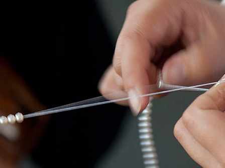 Шёлковая нить является традиционной для сборки ожерельяПосле сортировки отобранные жемчужины сажают на временную нить. Теперь придётся отсортировать их ещё раз, чтобы ожерелье выглядело идеально. Только после этого жемчужины нанизывают на постоянную нить.
